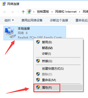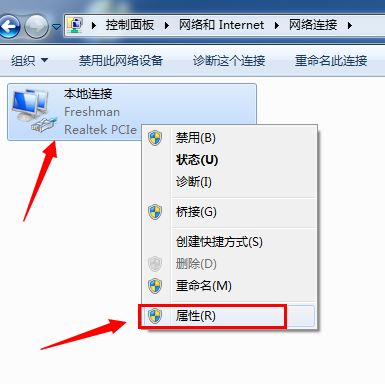 3、找到你的本地连接,右键单击,弹出一个菜单,然后选择属性。