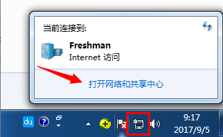 1、在电脑的右下角有网络快捷按钮,点击它,打开一个菜单,然后选择“打开网络和共享中心”