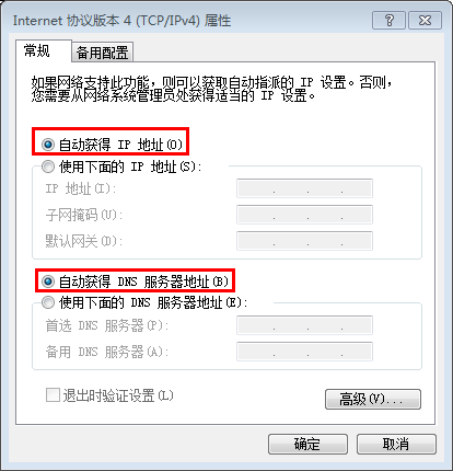 5、在这里勾选“自动获得下面的IP地址”和“自动获得DNS服务器地址”,最后点击确定按钮。