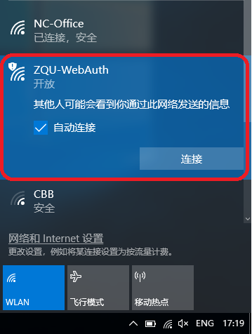(1)打开屏幕右下角“未连接”图标,选择信号ZQU-WebAuth(如图-4),点击连接。