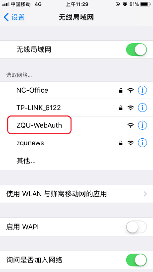 (1)打开“设置”中的无线网络(WLAN),选择无线信号ZQU-WebAuth(如图-1),然后点击。